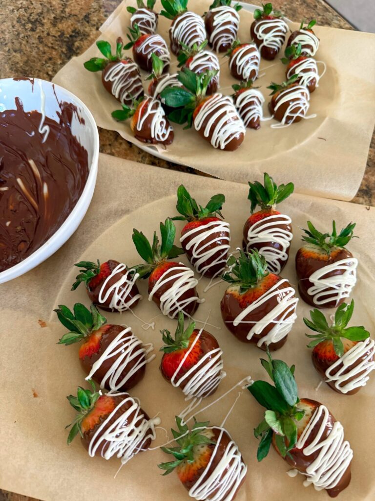 Chocolate covered strawberries. I made them for Valentine’s Day and the kids loved them! I just melted chocolate chips, added a little coconut oil, dipped the strawberries and drizzled with white chocolate. Super easy and it was a fun Valentine’s Day treat: