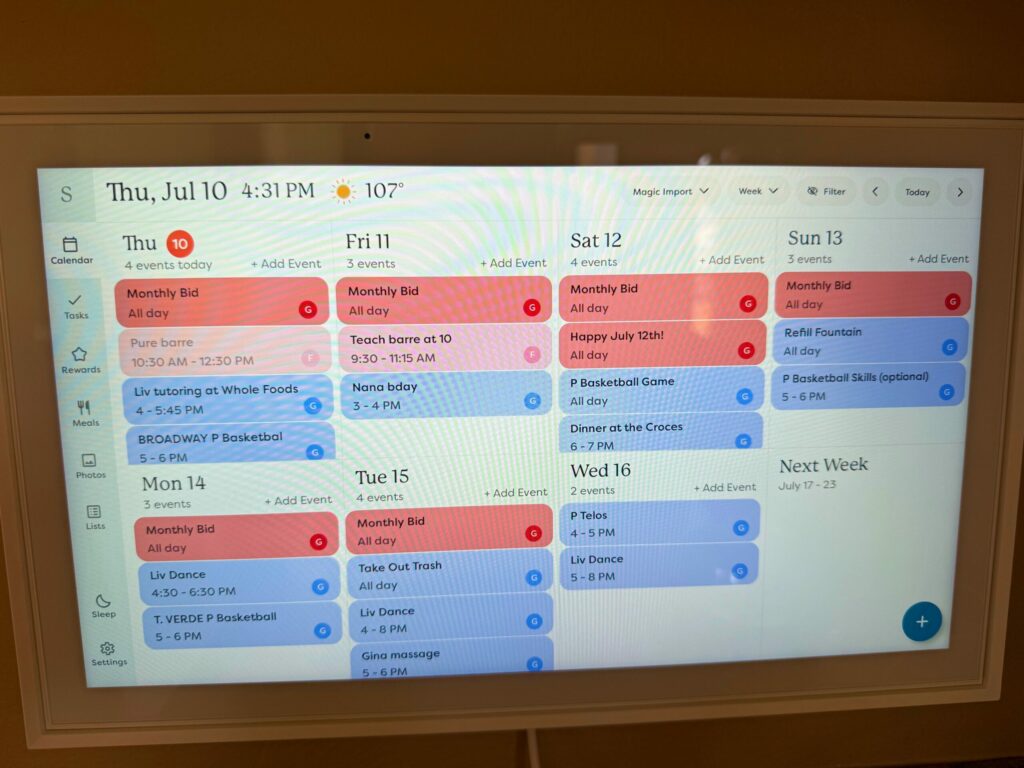We synced our Google calenders so we can easily see what’s going on each week/month/day, add in meal plans and links to the recipes for the meals, and chore charts and rewards for the kids. As a paper planner kinda gal, I’ve fought digital calenders for yearrrsssss. I eventually realized that with the kids’ schedules and the Pilot’s work schedule, this is the way to track everything for everyone.