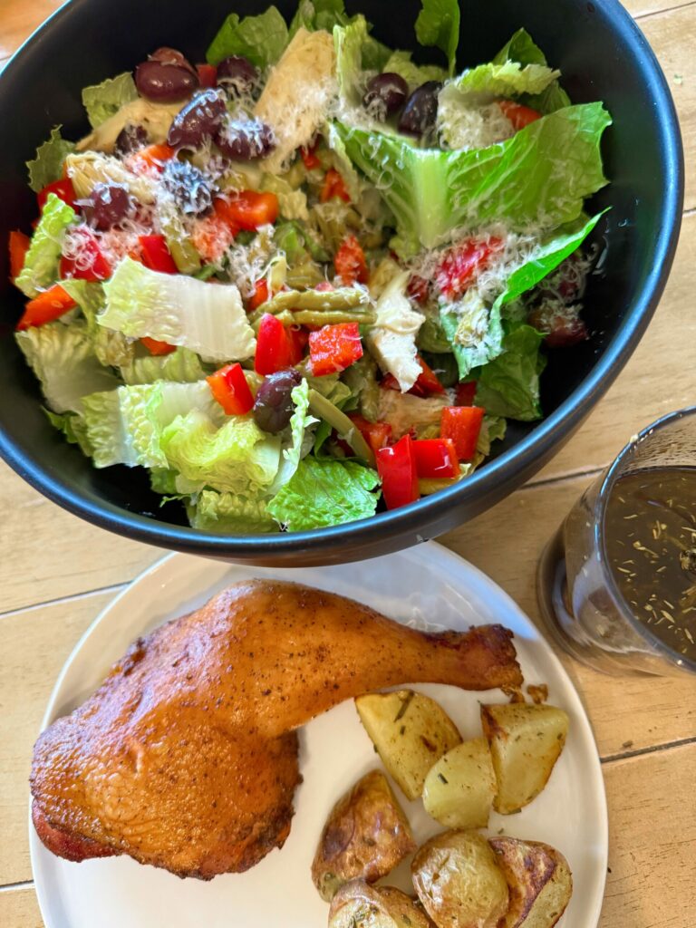 Simple family dinners are the best. Smoked chicken legs on the Traeger, roasted potatos with garlic and rosemary, and salad with homemade dressing