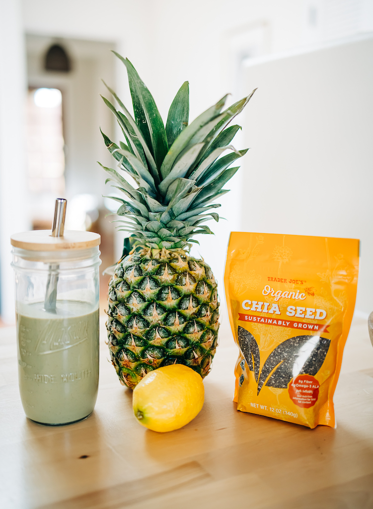 Chia Seed Powerhouse: Chia seeds, banana, spinach, mango, and coconut water.